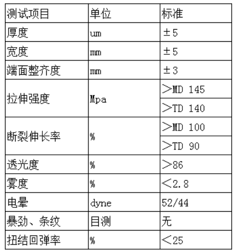 常規厚度:19μ,做印刷,糖果、牛肉粒包裝;23μ,做巧克力包裝。寬度可定制